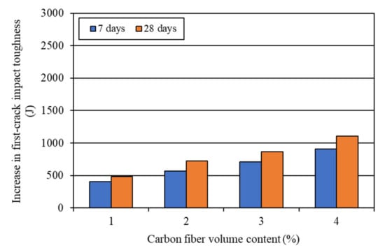 The impact toughness of the mortar composites was determined at 7 days and 28 days. The first-crack and ultimate impact toughness values were computed using Equation (5) based on the corresponding number of blows required for a visible first crack and ultimate failure (refer to Table 4). The average results of the impact toughness are shown in Table 5. It is evident from this table that the impact toughness increased greatly with the increase in the volume content of carbon fibers.