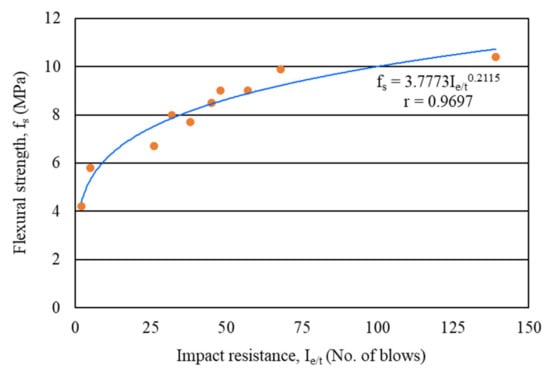 The correlation between the flexural strength (first-crack and ultimate) and impact resistance (first-crack and ultimate) of carbon fiber-reinforced mortar composite at the age of 28 days was sought in the present study. It was found that the flexural strength of mortar composite was strongly correlated with its impact resistance. The line of best fit showed a power relationship, as observed in Figure 14. The correlation coefficient (r) was 0.9697, which indicates an excellent relationship. Such a strong relationship between the flexural strength and impact resistance of carbon fiber-reinforced mortar composite was obtained because both properties were enhanced with a higher volume content of carbon fibers. Moreover, the power relationship (Figure 14) shows that the impact resistance of mortar composite increased more pronouncedly with the volume content of carbon fibers, as compared to its flexural strength. It should also be mentioned that the ultimate impact resistance was very high for the mortar composite with 4% carbon fibers (MCCF4), as evident from Table 4. Hence, the best-fit relationship line became much milder after 75 blows.