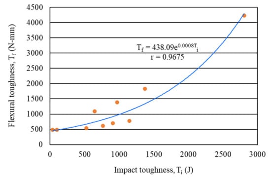 The correlation between the flexural toughness (first-crack and ultimate) and impact toughness (first-crack and ultimate) of carbon fiber-reinforced mortar composite at the age of 28 days was examined in the present study. It was found that the flexural toughness of mortar composite was strongly correlated with its impact toughness. The line of best fit exhibited an exponential relationship, as evident in Figure 15. The correlation coefficient (r) was 0.9675, which suggests an excellent relationship. Such a strong relationship between the flexural toughness and impact toughness of carbon fiber-reinforced mortar composite was obtained because both properties improved with a higher volume content of carbon fibers. Furthermore, the exponential relationship (Figure 15) indicates that the flexural toughness of mortar composite increased more pronouncedly than its impact toughness for any volume content of carbon fibers. It should also be noted that, for the mortar composite with 4% carbon fibers (MCCF4), the ultimate flexural toughness increased more significantly than the ultimate impact toughness, as evident from Table 3 and Table 5. Therefore, the best-fit relationship line became much steeper after 1500 N-mm flexural toughness.
