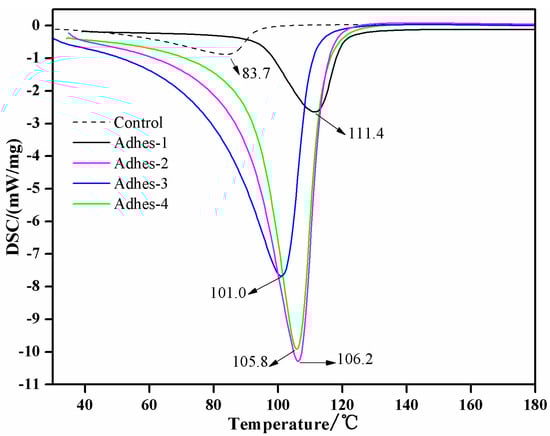 DSC results of Camellia oleifera cake-protein adhesives. Note: Control, pure Camellia oleifera cake-protein hydrolysate; Adhes-1, the pure Camellia oleifera cake-protein adhesive; Adhes-2, Camellia oleifera cake-protein adhesive modified with DSP; Adhes-3, Camellia oleifera cake-protein adhesive modified with SPI; Adhes-4, Camellia oleifera cake-protein adhesive modified with casein.