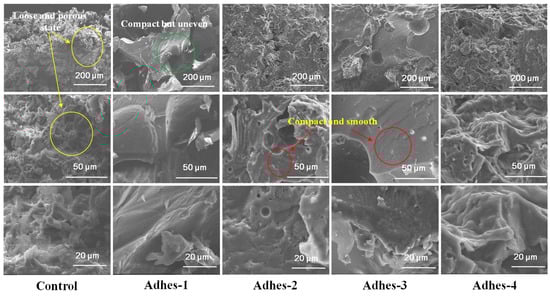 SEM images of fractured cross-sections of cured Camellia oleifera cake-protein adhesives. Note: Control, pure Camellia oleifera cake-protein hydrolysate; Adhes-1, the pure Camellia oleifera cake-protein adhesive; Adhes-2, Camellia oleifera cake-protein adhesive modified with DSP; Adhes-3, Camellia oleifera cake-protein adhesive modified with SPI; Adhes-4, Camellia oleifera cake-protein adhesive modified with casein.
