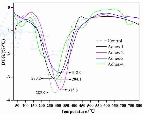DTG results of Camellia oleifera cake-protein adhesives. Note: Control, pure Camellia oleifera cake-protein hydrolysate; Adhes-1, the pure Camellia oleifera cake-protein adhesive, Adhes-2, Camellia oleifera cake-protein adhesive modified with DSP; Adhes-3, Camellia oleifera cake-protein adhesive modified with SPI; Adhes-4, Camellia oleifera cake-protein adhesive modified with casein.