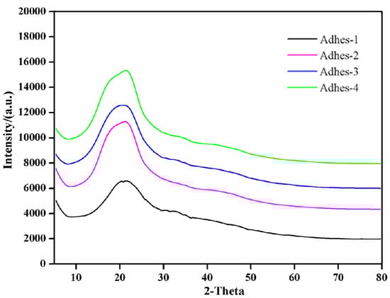 XRD results of curing products of Camellia oleifera cake-protein adhesives. Note: Adhes-1, the pure Camellia oleifera cake-protein adhesive; Adhes-2, Camellia oleifera cake-protein adhesive modified with DSP; Adhes-3, Camellia oleifera cake-protein adhesive modified with SPI; Adhes-4, Camellia oleifera cake-protein adhesive modified with casein.