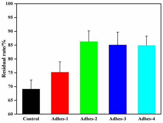 Insoluble rate of cured Camellia oleifera cake-protein adhesives. Note: Control, pure Camellia oleifera cake-protein hydrolysate; Adhes-1, the pure Camellia oleifera cake-protein adhesive; Adhes-2, Camellia oleifera cake-protein adhesive modified with DSP; Adhes-3, Camellia oleifera cake-protein adhesive modified with SPI; Adhes-4, Camellia oleifera cake-protein adhesive modified with casein.