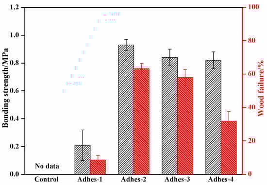 Results of bonding strength and wood failure of Camellia oleifera cake-protein adhesives. Note: Control, pure Camellia oleifera cake-protein hydrolysate; Adhes-1, the pure Camellia oleifera cake-protein adhesive; Adhes-2, Camellia oleifera cake-protein adhesive modified with DSP; Adhes-3, Camellia oleifera cake-protein adhesive modified with SPI; Adhes-4, Camellia oleifera cake-protein adhesive modified with casein.