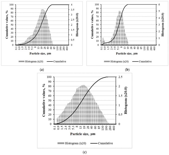 The particle size distributions of OPC are shown in Figure 1a. The particles of OPC varied in the range between 1.5 µm and 60 µm and average particles had the size of d = 21.66 µm. The particles of silica fume had a more narrow interval (from 1.5 µm to 19 µm) than particles of OPC and the size of average particles was 6.81 µm (Figure 1b). The particles of ground glass waste belong to a wide range of distribution from 0.9 µm to 190 µm (Figure 1c), and the size of the average particles consisted of d = 28.45 µm.