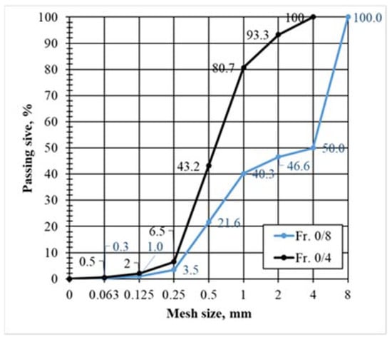 In Mix 1 and Mix 2, only expanded glass aggregates of different fractions were incorporated (Table 4). For mixture 3, expanded glass aggregates and expanded clay aggregates were used together. The right choice of granulometry for shotcretes affects the main properties, such as the strength, density, and thermal conductivity of the materials. In the preparation of Mix 1–Mix 3, the spaces between aggregate particles were considered. The lower number of spaces led to lower fine fractions and Portland cement. In order to fill spaces maximally, the required number of aggregates was selected using the theory of dense packing [25].