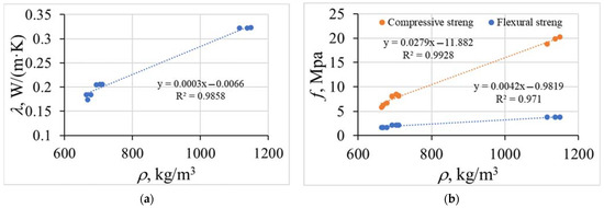 The relation between densities ρ of the dry samples with: (a) thermal conductivity coefficient λ; (b) mechanical strength f.