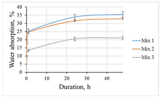 Water absorption is very important to thermal insulation materials because it changes the thermophysical properties. The lowest water absorption, 21.1%, was observed in the Mix 3 sample, which had the highest density and contained coarse EC aggregates (Figure 4). The Mixes 2 and 3 within the first 15 min showed very similar water absorption rates, 25.1% and 24.6%, respectively, but in the later stages, it was clear that the Mix 1 sample absorbed more water, as, after 48 h, it reached 35.5%, and the Mix 2 sample reached 33.6%. Even if Mix 1 absorbs more water than the Mix 2 sample, it is clear that there is a significant water absorption difference in the cases when the EG lightweight aggregate is used and when EC aggregate is used as a coarse lightweight aggregate.