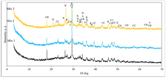 The PDF-2 database was used for the identification of XRD diffraction peaks [27]. Figure 7 presents the XRD diffraction of the shotcrete samples. The mineral composition of all investigated samples is similar for all tree samples. In these samples, portlandite, alite, larnite, calcium silicate hydrate, aragonite and calcite were detected. These minerals were formed during the hydration of OPC with cement supplementary materials. In the Mix 3 sample, a quartz phase was detected as well. This mineral could be from the expanded clay. Abdelfattah et al. [28] examined the mineral phase of quartz in the lightweight expanded clay aggregates before and after heat-treatment.