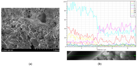 The transition zone between the expanded glass and hardened cement paste was investigated (Figure 8). This transition zone is difficult to detect because cement paste penetrates the aggregate due to its porous character (Figure 8a). From Figure 8b, it is revealed that the elemental composition of this composite material changes according to the analyzed place. The EDX analysis shows that silicon, oxygen and sodium dominated in the area of the expanded glass. A different chemical composition was detected in the matrix of the hardened cement paste. A lower amount of silicon, sodium and oxygen and a significantly higher amount of calcium were detected in the matrix. The other chemical elements did not change significantly. Similar EDX investigation results were also observed Bumanis et al. [13]. The minerals of the cement paste could be incorporated in the aggregates of the expanded glass.
