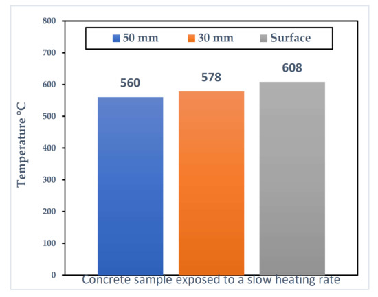 This mechanism is dependent on the temperature gradient within the concrete sample subjected to thermal loading [27]. As such, a slow heating rate will not be enough to generate the type of temperature gradient required to create enough thermal stresses to cause spalling [22]. Figure 3 (reported by [22]) shows that the in-through temperature is the same as the samples as Figure 1 when a slow heating rate of 1 °C/min is used. The figure shows that the difference between different depths and the heated surface is very small, meaning that a large enough thermal stress due to temperature gradient cannot form.