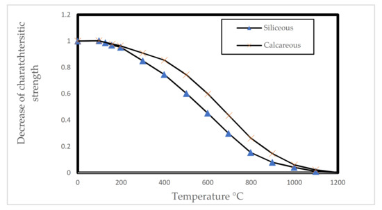 This mechanism is associated with the chemical degradation of the components of concrete at elevated temperatures. It is generally agreed upon that the strength of concrete decreases when exposed to high temperatures [32,33,34,35,36]. This process starts with hydrothermal reactions where water (free and chemically bound) starts evaporating [4]. At higher temperatures, the chemical bonds between the remaining parts of the concrete matrix start deteriorating [32]. It was observed [37] that the amount of Calcium Silicate Hydrate (C-S-H) within the concrete rapidly decrease as temperatures reach 800 °C. This is mainly due to the breakage of bonds that holds the crystals together. Figure 4 shows the reduction in the value of the characteristic compressive strength for concrete at elevated temperatures [38].