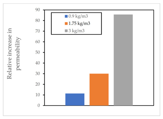 Miah et al. [21] found that the gas permeability of concrete samples was affected significantly by the applied loads. They reported that the permeability of concrete could either increase or decrease depending on the direction of the compressive load that is applied to the samples. According to the authors, axial permeability increased when preheated samples were loaded axially (parallel to the cracks). Radial permeability, on the other hand, reduced when the axial load was increased for preheated samples up to a certain level of load. After this, permeability stabilised and then increased with a further increase of the load. This is said to be the result of the closing of the cracks (due to the load) and then the opening of the cracks at higher loads due to lateral expansion (Poisson’s effect).