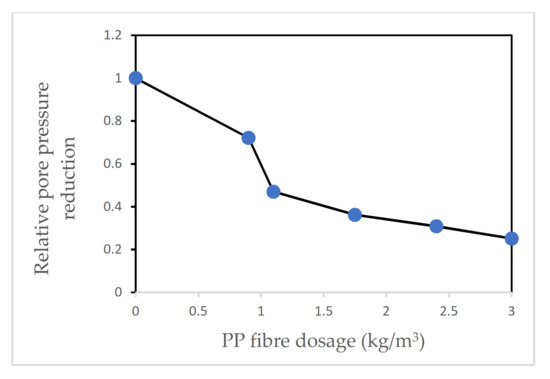 Relative reduction in the peak pore pressure with the increased dosage of PP fibres.