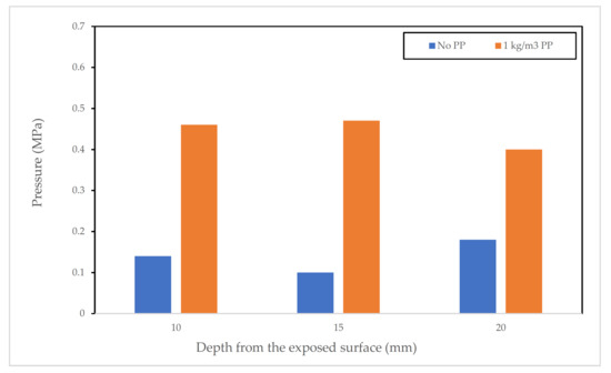 Kalifa et al. [17] investigated the effects of adding PP fibres to HPC at elevated temperatures. Based on the results, it was observed that the addition of PP fibres improved the performance of concrete at elevated temperatures. The researchers noted that this improvement was accompanied by a big rise in the permeability of the samples that had PP fibre added to them. For mixes with a dosage of 3 kg/m3 of PP fibre, it was noticed that the relative permeability (permeability of fibre samples/permeability of non-fibre samples) increased by as much as 85 times at 200 °C. It was also noted that the intrinsic permeability of all samples increased with rising temperature, but the rise in samples with PP fibres was far bigger than samples without fibres. This rise in permeability was accompanied by a big drop in pore pressure for the samples. Maximum pore pressure of 4 MPa was reported for samples without PP fibres whilst pore pressure had a peak value of just over 1 MPa when 3 kg/m3 PP fibre was added to the mix. Figure 5 and Figure 6 [17] show the relative increase in the gas permeability of the concrete mixes and the reduction in the value of the peak pore pressure compared to that of concrete mixes without PP fibres, respectively.