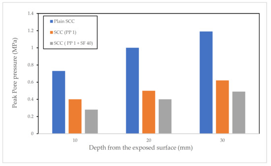 Ding et al. [68] explored the effect of different fibres on pore pressure for SCC at elevated temperatures. According to the study, pore pressure was reduced significantly in samples with fibres. This is explained by the introduction of extra ITZ around the fibres, which in turn enhances permeability. The increase in permeability was reported to inversely hinder the formation of moisture clog, and this delayed/prevented the occurrence of explosive spalling.