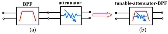 (a) Cascaded bandpass filter (BPF) and tunable attenuator. (b) Dual-function of filtering and attenuating.