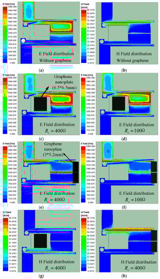 The electric and magnetic field distribution of the filter without (a,b) and with different graphene nanoplates (c–h).