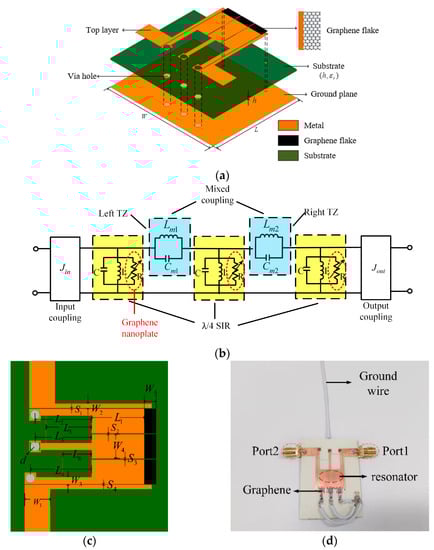 In order to study the effect of graphene nanoplates on the resonator, a second-order filter using λ/4 stepped impedance resonator (SIR) is designed as depicted in Figure 3a. Each resonator has a high impedance and a low impedance region. Graphene nanoplates are loaded on one side of the resonators. The electric coupling between λ/4 SIR is generated between the gap of the coupled low-sections, since the SIR has the maximum electric fringe field density at the open end, which is equivalent to a capacity Cm as shown in Figure 3b. On the other hand, the magnetic coupling is achieved by a conducting pin, which taps the two SIRs together and behaves as a coupling inductance and is equivalent to a inductor Lm as depicted in Figure 3b. Therefore, the mixed electromagnetic coupling is equivalent to a parallel resonator composed by Cm and Lm. When the mixed electromagnetic coupling structure resonates at a certain frequency, the impedance will be infinity so as to produce a transmission zero (TZ). Because the coupling resonant frequency can be flexibly controlled, the TZs can be located on either side of the filter freely, which can effectively improve the filter’s passband selection characteristics. The simulation results shown in Figure 4a,b confirms the above idea.