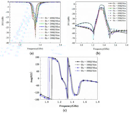 Comparison of the simulated and measured results for the proposed filter with tunable attenuation. (a) Magnitude S11. (b) Magnitude S21. (c) Phase of S21.