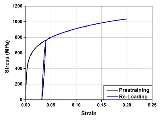 - The test piece placed in the 100 kN UTM was tensioned up to a pre-strain of 0.04 and then unloaded in the same manner as mentioned above (black line in Figure 3);