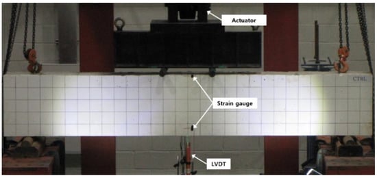 The Fe-SMA stirrups embedded in the specimens were activated through electrical resistance heating by supplying a current of 5 A/mm2. Since contact-type thermocouples generally measure the test piece temperature through a resistance change, they cannot accurately measure the temperature of an object in which the current flows. Moreover, as the Fe-SMA stirrups are embedded in concrete, it is also impossible to measure the temperature with non-contact heat sensors. Therefore, a preliminary experiment was performed to measure the time required for the Fe-SMA stirrup surface to reach 160 °C when a current of 5 A/mm2 was supplied. It was confirmed that the stirrup surface reached 160 °C when a current of 5 A/mm2 was supplied for 26 s. Therefore, the Fe-SMA stirrups embedded in the specimens were heated by supplying a current of 5 A/mm2 for 26 s. After the heated Fe-SMA was sufficiently cooled, a four-point loading test was conducted to evaluate the shear performance of the concrete beam using a 2000 kN actuator. As shown in Figure 1, the distance between the loading points on each specimen was 400 mm, and each loading point was 200 mm away from the center of the specimen in both directions. In the test, loading was applied at a rate of 1 mm/min through displacement control. The deflection of each specimen due to loading was measured using two linear variable differential transformers (LVDTs) with a capacity of 200 mm, which were installed at the lower center of the beam. The strains of the concrete, tensile rebars, compressive rebars, and Fe-SMA stirrups were measured using strain gauges. However, the stirrup strains of the specimens in which the Fe-SMA stirrups were activated were not measured due to damage to the strain gauges during electrical resistance heating. In addition, initial crack formation and crack propagation that occurred in the specimens during loading were visually observed and recorded on the surface of the specimens. Figure 4 shows the setup of the four-point bending test.