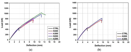 Figure 5 shows the failure modes of the specimens upon the completion of the test. As shown in Figure 5a, CTRL with no Fe-SMA stirrup exhibited a typical shear failure pattern due to diagonal tension cracks in the test section after the occurrence of flexural cracks in the center of the beam. The failure modes of all the specimens were similar to that of CTRL. N300, a specimen with non-activated Fe-SMA stirrups, however, showed more diagonal tension cracks than A300, a specimen with activated Fe-SMA stirrups. The activation of the Fe-SMA stirrups decreased the number of diagonal tension cracks due to the generated recovery stress in A200 and N200, for which the reinforcement spacing of the Fe-SMA stirrups was 200 mm. It appears that the number of diagonal tension cracks decreased because the recovery stress generated by the Fe-SMA stirrup activation acted as active confining pressure on the specimens.
