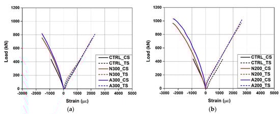Comparison of load–strain curves. (a) N300 and A300. (b) N200 and A200.