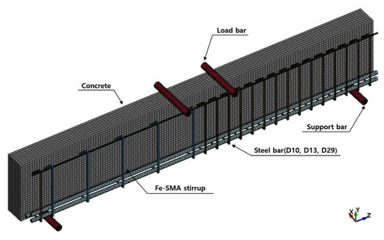 Figure 9 shows a finite element (FE) analysis model to predict the shear behavior of the RC beam reinforced with the Fe-SMA stirrups. FE analysis was conducted using LS-DYNA [], a commercial FE analysis software program. Concrete was modeled with an eight-node integration solid element with a size of 20 mm, while the rebars and Fe-SMA stirrups were modeled with a two-node Hughes–Liu beam element with a size of 25 mm. The supports and loading points were modeled with rigid elements to prevent the concentration of loads. The rebars, stirrups, Fe-SMA bars, and concrete were assumed to be completely attached. To implement this, the Lagrange in solid command was used. In addition, the automatic surface to surface command was used to prevent the infiltration of the support and load bars into the concrete solid element.