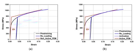 As shown in Figure 3, when the temperature of the test piece heated to 160 °C reached room temperature, the recovery stress generated in it was approximately 335 MPa. When it was loaded again, the stress–strain relationship returned to the previous pre-strain point. After this point, the stress–strain relationship of the test piece was similar to that of the non-activated test piece.