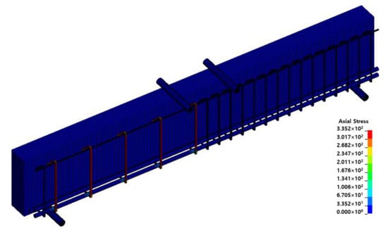where is the temperature change (°C) and is the thermal expansion coefficient. A thermal expansion coefficient of −21.4 × 10−6 was applied to simulate the recovery strain according to the Fe-SMA temperature increase, and was set as 140 °C, obtained by subtracting room temperature (20 °C) from the heating temperature (160 °C). As shown in Figure 11, when 140 °C was applied, the compressive stress acting on the Fe-SMA stirrups was the same as the recovery stress (335 MPa).