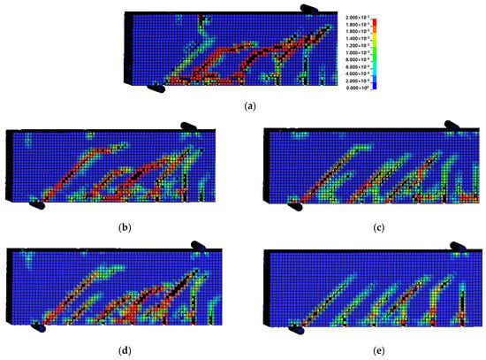 Figure 12 shows the failure modes of the specimens in the test section predicted through FE analysis. These failure modes were confirmed through the average strain of concrete. If the strain of a concrete element exceeded the limit of the concrete plastic strain, the element was deleted. With regard to the failure modes of all the specimens, shear failure due to the diagonal tension cracks caused by the increasing load after the occurrence of initial cracks at the lower center of the specimen was predicted in the same manner as in the experiment. As shown in Figure 12a, the failure mode of CTRL predicted through FE analysis was the shear failure caused by a rapid brittle fracture in the test section, which was similar to the test results. The failure modes of the specimens reinforced with the Fe-SMA stirrups are shown in Figure 12b–e. The A300 and A200 specimens, which had activated Fe-SMA, exhibited lower concrete strains and reduced crack patterns than N300 and N200, which had non-activated Fe-SMA. Therefore, it was judged that the proposed