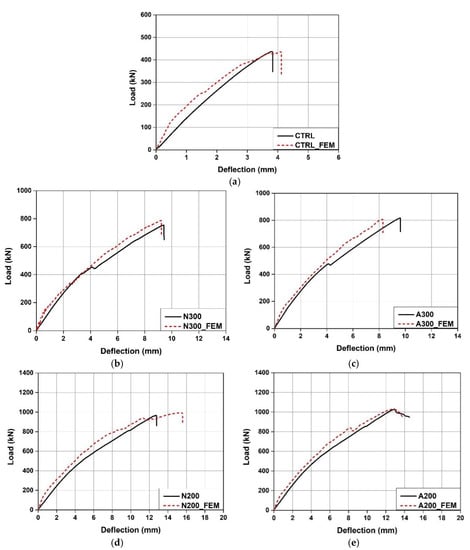 Comparison of load–deflection curves between experiment and FE model. (a) CTRL. (b) N300. (c) A300. (d) N200. (e) A200.