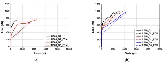 Figure 14 compares the load–Fe-SMA stirrup strain relationships measured through the experiment with those predicted through FE analysis. In the analysis, when N300 reached the ultimate load, the strains at S2 and S3 were predicted to be 1233 and 4574 με, respectively. These values differed from the experimental results only by 1.5% and 2.6%, respectively. In the case of N200, when the ultimate load was reached, the strains at S1 and S3 were predicted to be 2627 and 4110 με, respectively, which differed from the experimental results by 22.8% and 2.1%, respectively. The average difference in Fe-SMA stirrup strain between the experimental and analysis results at the ultimate load was 7.3%, indicating that the analysis could predict the Fe-SMA stirrup strain accurately.