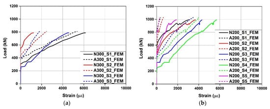 Figure 15 shows the load–Fe-SMA stirrup strain relationship predicted through FE analysis. The loads of A300 and A200 at the time of strain increase were predicted to be 382 and 507 kN, respectively, which were 45.5% and 20.2% higher than those of N300 and N200, respectively. In addition, as the Fe-SMA stirrups were activated, the Fe-SMA stirrup strain under the ultimate load generally decreased, and major deformation occurred at positions A300_S1, A200_S1, and S4 compared to the constant strain distribution observed from the specimens with non-activated Fe-SMA stirrups. These results confirmed that the activation of Fe-SMA stirrups can delay the occurrence of shear cracks. This appears to be because the active confining pressure generated by the recovery stress was exerted on the inside of the concrete beam.