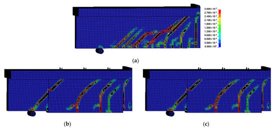 Failure mode predicted by FE model. (a) Beam 1. (b) Beam 2. (c) Beam 3.