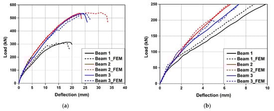For Beam 1, a non-reinforced specimen, shear failure occurred after the propagation of several diagonal tension cracks in the entire section of the specimen. In the case of Beam 2 and Beam 3, which were reinforced with Fe-SMA strips, bending-shear crack patterns were predicted. Moreover, compared to Beam 3 with non-activated Fe-SMA strips, larger vertical cracks caused by the bending load occurred in Beam 3 with activated Fe-SMA strips. These failure and crack patterns were relatively similar to those of the results reported by Czaderski et al. [].