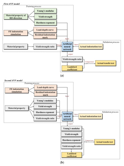 Flow chart for predicting anisotropy properties with two kinds of ANN model: (a) First ANN model, (b) Second ANN model.