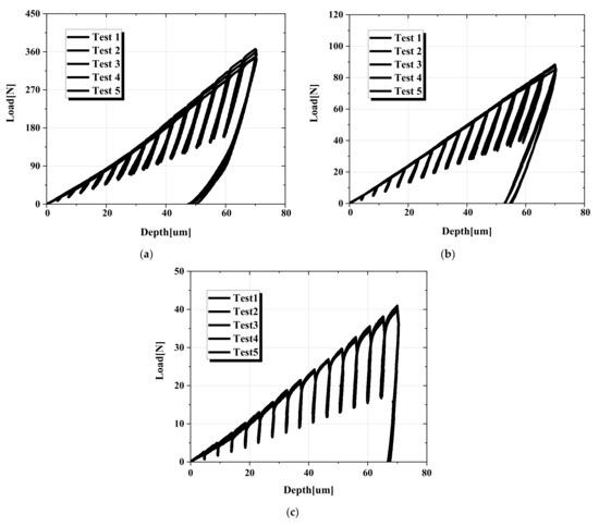 Load–depth curves from the indentation tests: (a) TRIP1180, (b) AA6063-T6, (c) Zn-Cu-Ti alloy.