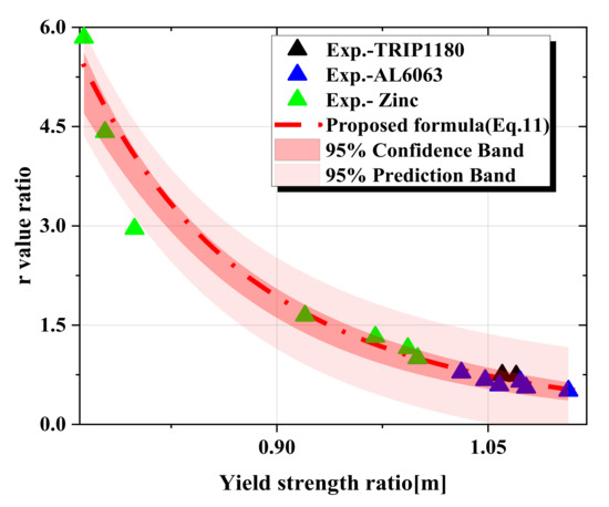 In the ABAQUS/standard material model, Hill’s yield and its six parameters were used to define the plastic properties [15,25,26]. Among those parameters, R11, R22, and R33 were parameters for the normal direction, and R12, R13, and R23 were parameters for the shear direction. These parameters were used as properties representing anisotropy, with R11 defining the ratio (m) of the yield strength between the RD direction and the TD direction. The other Hill ratios were assumed to be 1. The anisotropy properties in the RD and TD directions, as well as properties for the other directions, can be derived using the characteristics of the residual indentation marks from the FE model as the basis for the ANN model. Moreover, R11 and R33, which relate to Hill’s yield criterion, are also associated with Lankford coefficients, as given in Equation (9), which means that the yield strength ratio (m) is related to the Lankford coefficient (r). Therefore, the relationship between the yield strength ratio and r-value ratio from RD to TD can be obtained through these two equations to predict the yield strength ratio (m) in the RD direction and any other direction. As above, the r-value ratio (rr) of the predicted direction to RD can be obtained by Equation (10). Nevertheless, to predict the r-value more accurately, we fitted several sets of data of the three actual materials and obtained a better relationship formula between the r-value ratio and yield strength ratio, as shown in Equation (11). The proposed fitting formula was more appropriate to the actual experimental data than the previous formula, as shown in Figure 10a, and the R-square of the proposed formula was 0.96088. The standard deviation of experiments was less than 0.1. The accuracy of the proposed formula was then verified with other experimental data for these three materials in Figure 10b, which showed a good agreement with experimental data. And Figure 11 shows that our actual experimental data were basically within the 95% confidence interval and prediction regions of the proposed formula. Thus, our prediction model can predict the r-value in different orientations by using the r-value at RD from the tensile test.