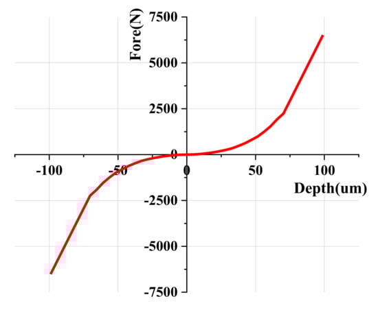 The spring with rigidity was obtained using Equation (15) as the reciprocal of the sum of device compliance and mounting compliance, which locates the bottom of the specimen in the FE model. Figure 14 demonstrates the FE model added a spring that represents the compliance of the frame of the test machine nodes on the baseline and connects it to the one spring node using kinematic coupling [31]. As shown in Figure 15, the stiffness of the spring was set to be symmetrical with respect to the zero point in the loading and unloading processes of the indentation test. The simulated result of the load–depth curve using the FE model with the added spring is shown in Figure 12a. Compared with the previous analysis, the deviation of maximum load, elastic area, plastic area, plastic area ratio, initial unloading slope, and final depth improved by 3.13%, 49.45%, 10.42%, 12.28%, 154.51%, and 32.54%, respectively. Moreover, we compared the experimental load–depth curve of AA6063-T6 and Zn-Cu-Ti with the FE simulation load–depth curve to verify whether adding the spring to the FE model applies to other materials, as shown in Figure 12b,c.