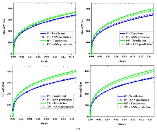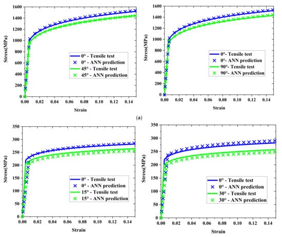 - The proposed two types of artificial neural network models can predict the anisotropic properties of materials, where the first prediction model, with RD characteristics as input parameters, can predict the yield strength ratio and the Lankford coefficient well. On the other hand, in cases without RD characteristics as input parameters, the second model provides a comprehensive prediction of the material’s properties, including its elastic–plastic and anisotropic properties.