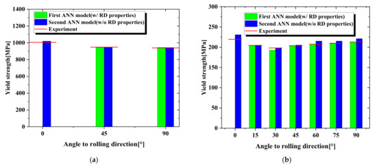 Moreover, we compared the results of yield strength ratio and Lankford coefficient of the two ANN prediction models, which are depicted in Figure 21 and Figure 22. The figures clearly show that the prediction accuracy of the first prediction model was higher than that of the second model due to the additional RD properties as input parameters and a small number of prediction targets with the less difficult for prediction. However, the second model comprehensively showed that the properties of the material, including the elastoplastic properties and anisotropy properties of the material, can be estimated through the indentation test. Therefore, when the experimental data in the RD direction can be obtained, the first prediction model can be used to accurately predict the yield strength ratio and the Lankford coefficient of the material. If there is no condition to obtain the attributes in the RD direction, the second prediction model can be used for comprehensive attribute prediction.