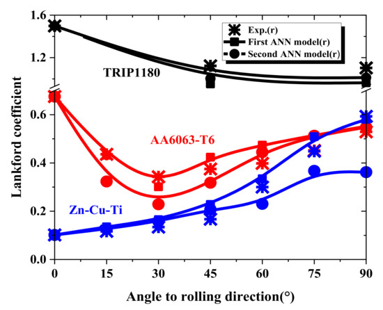 - The predicted yield strength ratios using the first model of TRIP1180, AA6063-T6, and Zn-Cu-Ti alloy had a maximum deviation from the experimental results of 0.6%, 2.6%, and 4.9%, respectively. At the same time, the Lankford coefficient predicted by our model was consistent with the experimental results. The deviations in the predicted stress–strain flow curves were all less than 5%. Furthermore, the flow curve predicted for each material using the improved ANN model showed a maximum deviation from the tensile test of 4.7%.