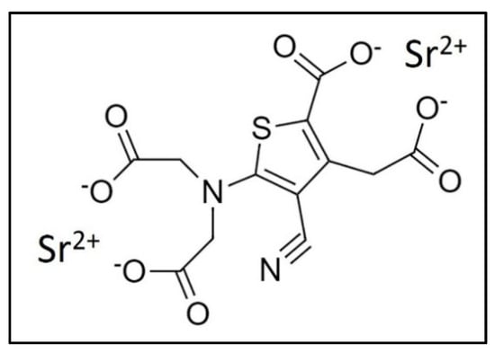 However, the total amount of Sr in the skeleton is small in comparison to that of Ca since it reaches about 0.035 % of the total Ca content []. Even if in the past Sr has attracted less attention than other divalent metals such as Ca and magnesium (Mg), the interest regarding Sr has increased in the last decades due to the development of strontium ranelate (SrRan), an orally active agent acting as an anti-osteoporosis drug [,,]. SrRan is a salt of thiopheneacetyl acid, where two atoms of stable divalent Sr are linked to an organic moiety, the ranelic acid. Sr in the form of such a salt was firstly introduced by Marie et al. in 1993 [], while SrRan was developed as a drug by Servier (France) [].