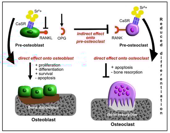As discussed above, Sr exerts its effects on osteoblasts and osteoclasts, inducing or suppressing different signaling pathways, with the ability to regulate cytokine signals between these two cell types, affecting their crosstalk. Osteoblast-lineage cells produce RANKL, a cytokine also known as osteoclast differentiation factor (ODF) that binds the cell surface receptor activator of nuclear factor-kappa B (RANK) of osteoclasts and osteoclast precursors, stimulating their differentiation. Osteoblastic cells also express OPG: this cytokine, acting as a decoy receptor, protects bone tissue from excessive resorption by blocking RANKL and preventing it from interacting with RANK, with consequent inhibition of osteoclast differentiation []. Consequently, the OPG/RANKL ratio is pivotal for balanced bone resorption, as proven by a decreased ratio found in bone loss circumstances, such as in post-menopausal women. Brennan et al. observed that the administration of SrRan to human primary osteoblasts, reproducing the same concentration found in the serum of patients taking 2 g per day, enhances OPG mRNA expression and OPG production and release []. In addition, the same authors also observed the suppression of RANKL mRNA expression and the decrease of membrane-associated protein levels of RANKL. This down-regulation of the osteoclastogenesis by indirect stimulation of osteoblasts is mediated by the activation of osteoblastic CaSR []. Atkins et al. pointed out that the effect of Sr on RANKL expression is not dose-dependent and may vary from donor to donor, but mRNA levels of RANKL and OPG under Sr exposure are always definitely in favor of OPG, confirming the extended inhibitory effect on osteoblast-mediated osteoclast differentiation []. Peng et al. observed that MC3T3 cells released OPG in the medium after treatment with Sr, and the MC3T3-conditioned medium was able to reduce the RANKL-induced pre-osteoclast differentiation and functional activity in RAW 264.7 cells []. This was further confirmed by the attenuation of the reduction of osteoclast differentiation following the addition of an anti-OPG antibody to the conditioned media. This evidence demonstrates the anti-catabolic effect of Sr onto osteoclasts, an effect that is mediated partly by OPG, with the indirect intervention of osteoblasts. On the other hand, Sr exerts anabolic effects onto osteoblasts, favoring the bone formation and playing an uncoupling action on bone cells, as briefly illustrated in Figure 2 [].