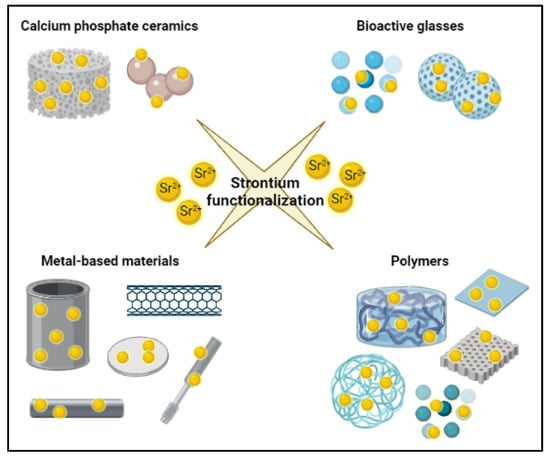 Thus, four classes of biomaterials mainly used in BTE, i.e., calcium phosphate ceramics, bioactive glasses, metal-based materials, and polymers, are considered. The functionalization with Sr ions and the in vitro and/or in vivo evaluations are briefly discussed and reported in Tables to underline the promising introduction of Sr-functionalization in treating bone defects or diseases as a potential osteopromoting dopant.