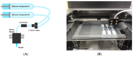 (A) A schematic diagram of the printing mechanism; and (B) a photo of printing the silicone dumbbell specimens.