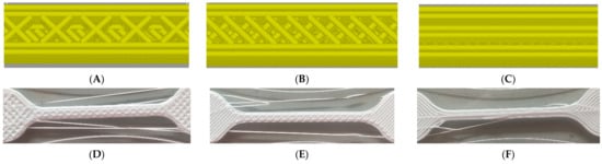 The parameter effects on the internal structure can be referred to the results of the cross-section images in Figure 9. The higher infill densities demonstrate more solid cross-sectional images. Figure 9A shows a hollow and collapsing top surface due to the lowest infill density of 15%. It is an objective to avoid collapsing top surfaces and internal voids due to the gel-like nature of pre-cured silicone. Otherwise, this consequence affects the tensile properties. The solid images of Figure 9E,I proves the higher values of the corresponding combinations in terms of tensile stress in Figure 5B,D. Even if the infill density is only 90%, the cross-sectional images already have no visible voids of any kind in Figure 9C,I.